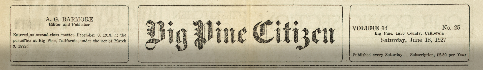 The Big Pine Citizen was the weekly newspaper of Big Pine, California, a town in the northern Owens Valley of the California Sierras. The Big Pine Citizen Newspaper Collection holds issues from the years 1922, and 1924 to 1928, the decade in which the Owens Valley Water Wars between the City of Los Angeles and the people of the Owens Valley over the control of land and corresponding water rights was at its height. Thus, the newspapers contain much information, from the viewpoint of Owens Valley residents, on Los Angeles' control of the Owens Valley water supply.